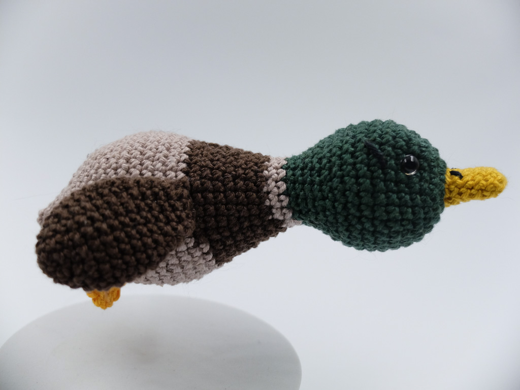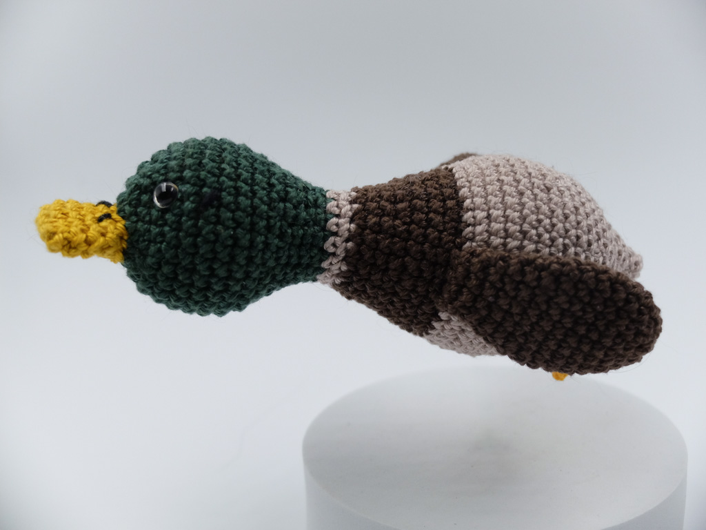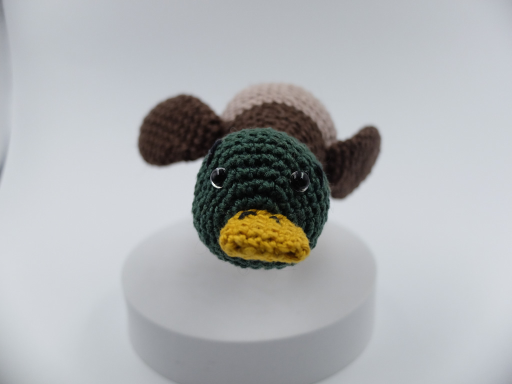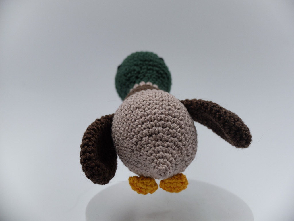 Mała, ale z charakterem. Ta ręcznie szydełkowana kaczka z zieloną głową i żółtym dziobem potrafi rozbawić, rozczulić, a nawet… osądzić lekkim przekrzywieniem głowy.